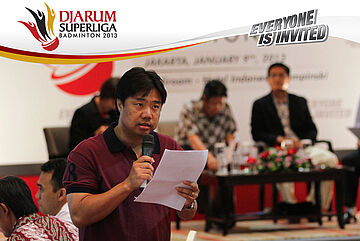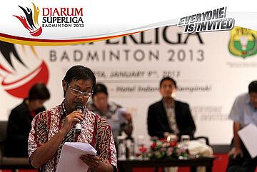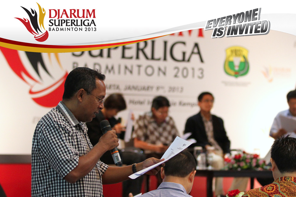 Perwakilan PB. Jaya Raya Jakarta, Bambang Suprianto Sedang Membacakan Susunan Pemain Jaya Raya Jakarta Yang Akan Turundi Djarum Superliga Badminton 2013