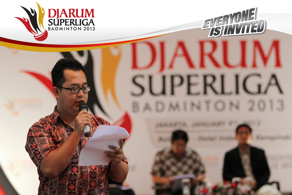 Perwakilan PB Djarum, Antonius Budi Ariantho sedang membacakan susunan pemain tim PB Djarum yang akan bertanding di Djarum Superliga Badminton 2013.