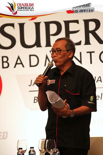 Koesdarto Pramono memberikan sambutan pada konferensi pers Djarum Superliga Badminton 2013, Selasa, (29/1)