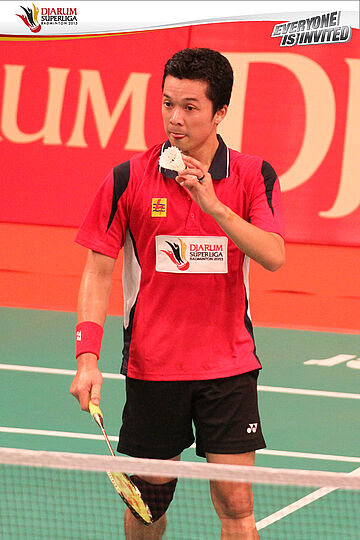Taufik Hidayat membersihkan keringat ketika berlaga melawan pemain Tonami Badminton, Riichi Takeshita. 20.