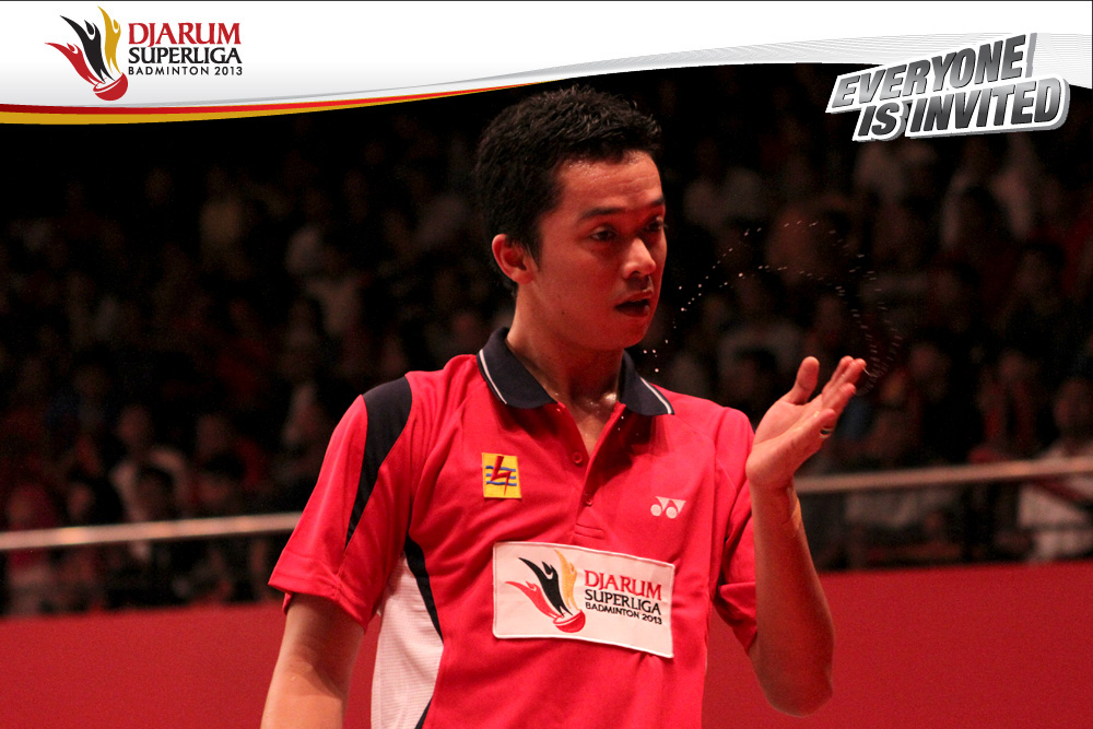 Pemain SGS PLN Bandung, Taufik Hidayat meminta pergantian kok ketika berlaga melawan pemain Tonami Badminton, Riichi Takeshita.