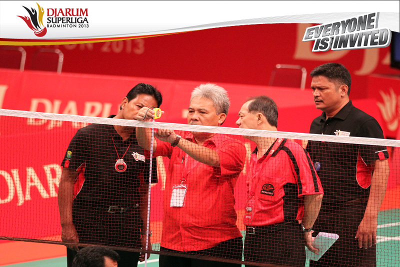 Pengawas Pertandingan melakukan pengecekan net sebelum digunakan untuk bertanding
