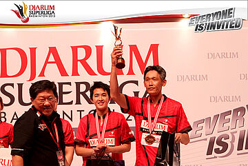 Fung Permadi mengangkat trofi ketiga Djarum Superliga Badminton 2013 yang berhasil diraih PB Djarum