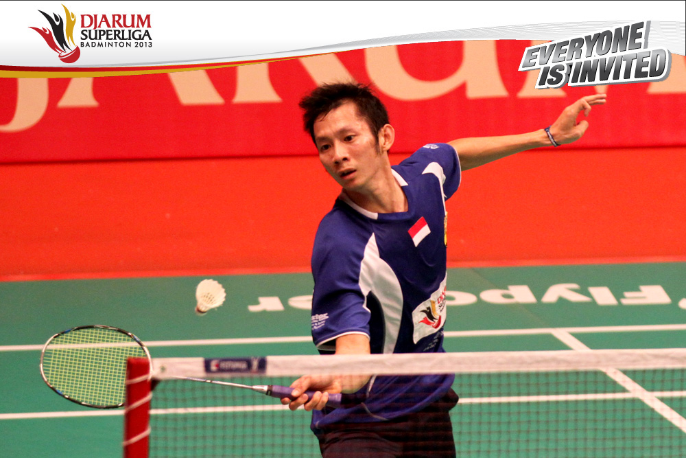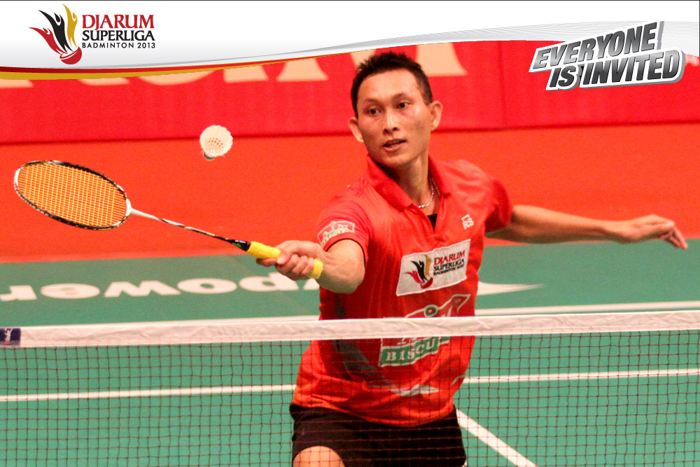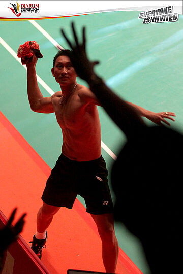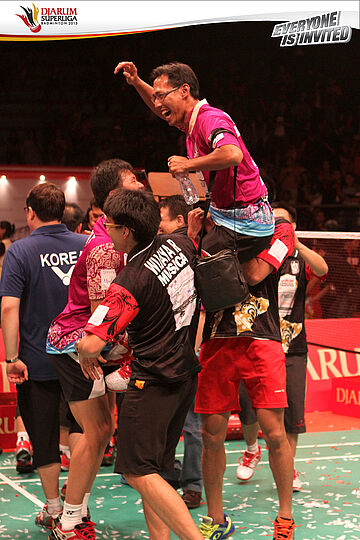 Selebrasi tim PB Musica Champion dengan mengepung Chou Tien Chen setelah berhasil memenangi partai penentu final Djarum Superliga Badminton 2013