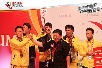 Tim Jaya Raya Suryanaga mengangkat trofi juara ketiga Djarum SUperliga Badminton 2013