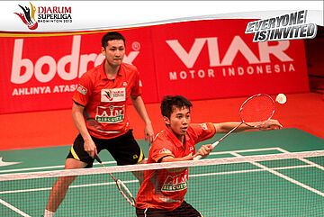 Maneepong Jongjit dan Nipitphon Puangpuapech (Tangkas Specs) mengembalikan kok ke arah Alvent Yulianto dan Ryan Agung (Jaya Raya Suryanaga)