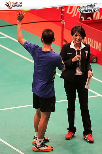 Sony Dwi Kuncoro (kiri) mengucapkan terima kasih dengan cara melambaikan tangan kepada seluruh penonton yang memenuhi DBL Arena Surabaya saat diwawancarai reporter Trans7