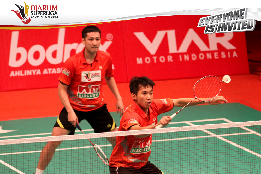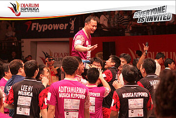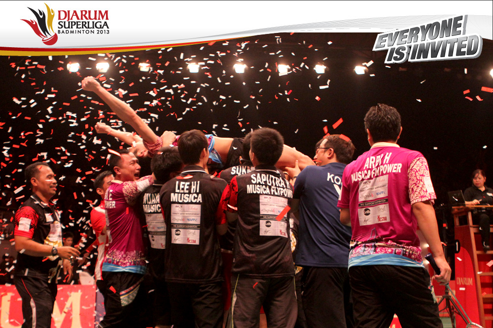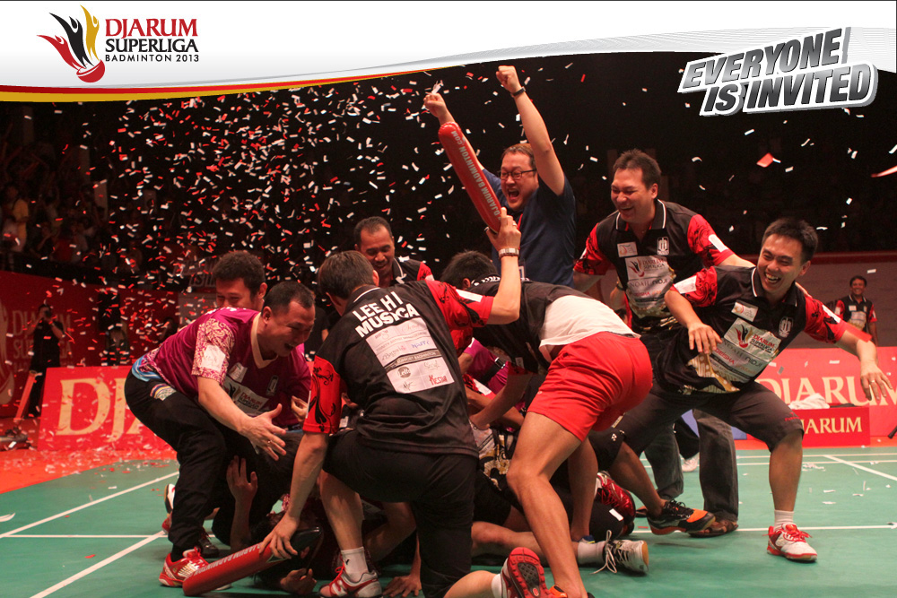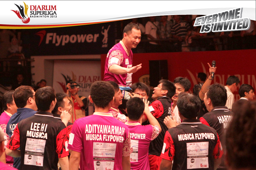 Selebrasi tim PB Musica Champion dengan mengangkat Chou Tien Chen setelah berhasil memenangi partai penentu final Djarum Superliga Badminton 2013