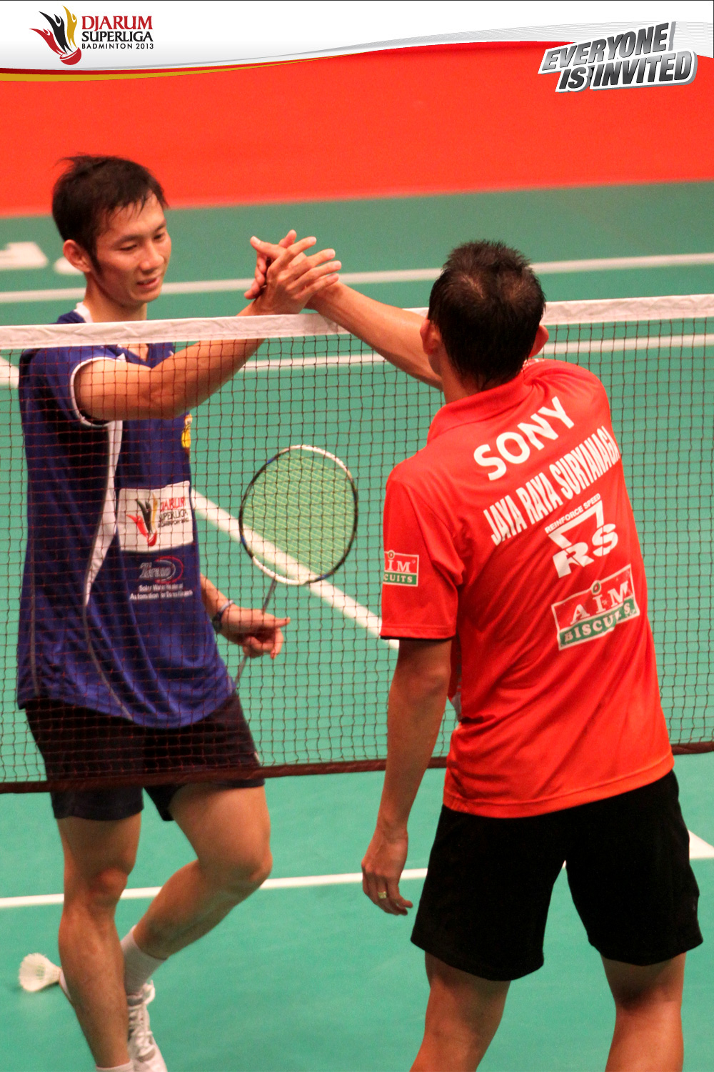 Nguyen Tien Minh dari Tangkas Specs (kiri) bersalaman dengan Sony Dwi Kuncoro (Jaya Raya Suryanaga) usai bertanding dalam partai perebutan juara ke tiga Djarum Superliga Badminton 2013