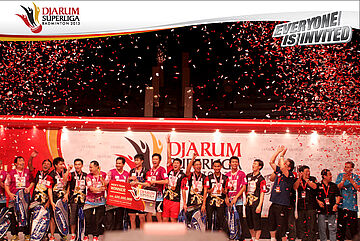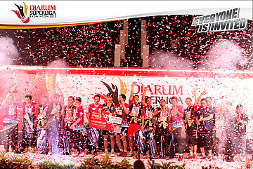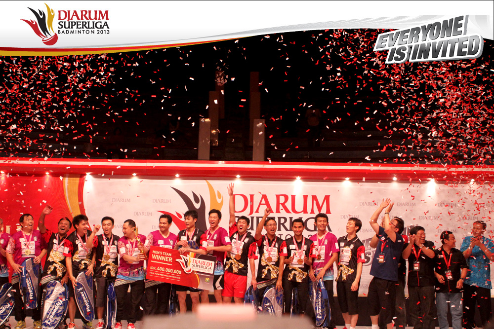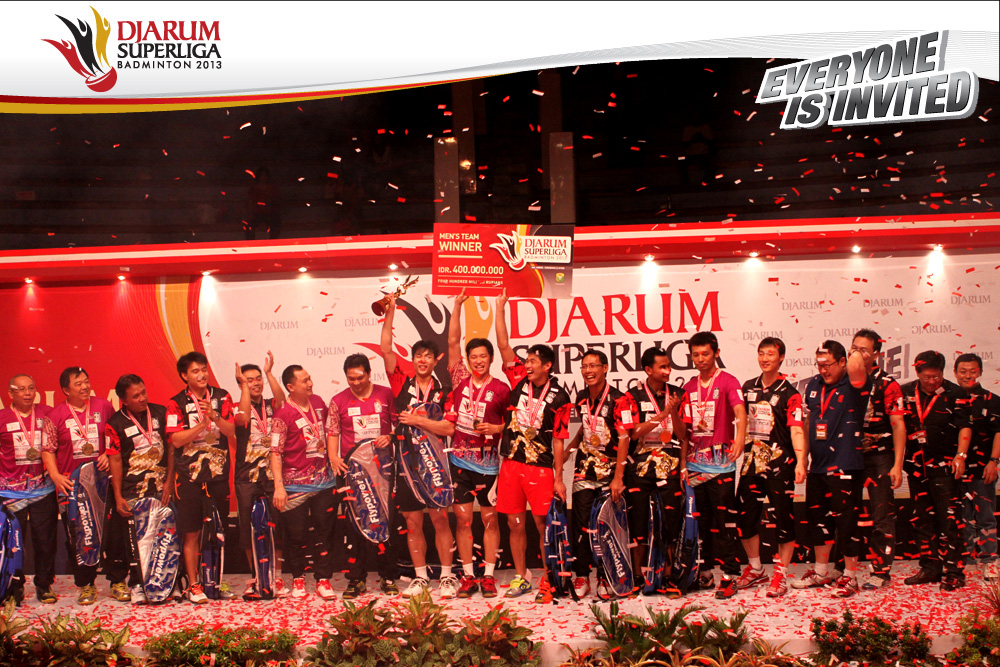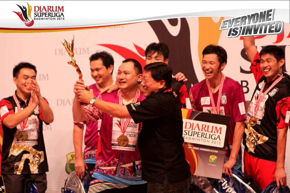 Selebrasi PB Musica Champion setelah berhasil memastikan diri menjadi juara di Djarum SUperliga Badminton 2013