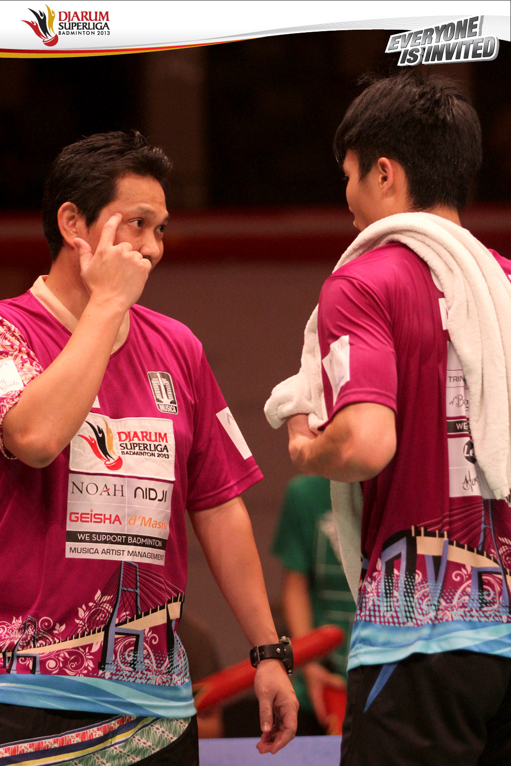 ariyanto Arbi (kiri) saat memberikan motivasi kepada Chou Tien Chen di sela-sela jeda set pertama