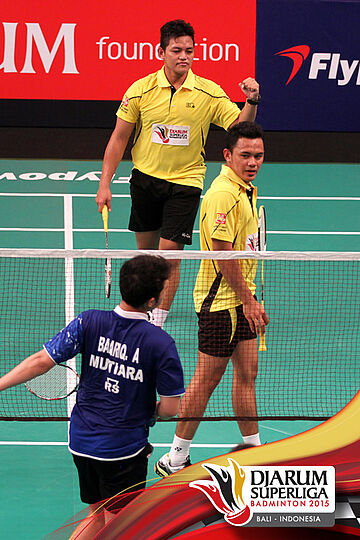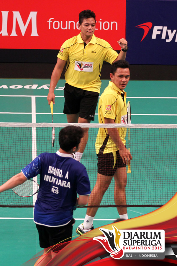 Ekspresi Riyo Arief/Rizky Hidayat (Hi Qua Wima) saat berhasil mencuri poin dari Altof Baariq/Reinard Dhanriano (Mutiara Cardinal).