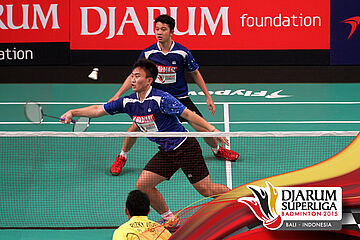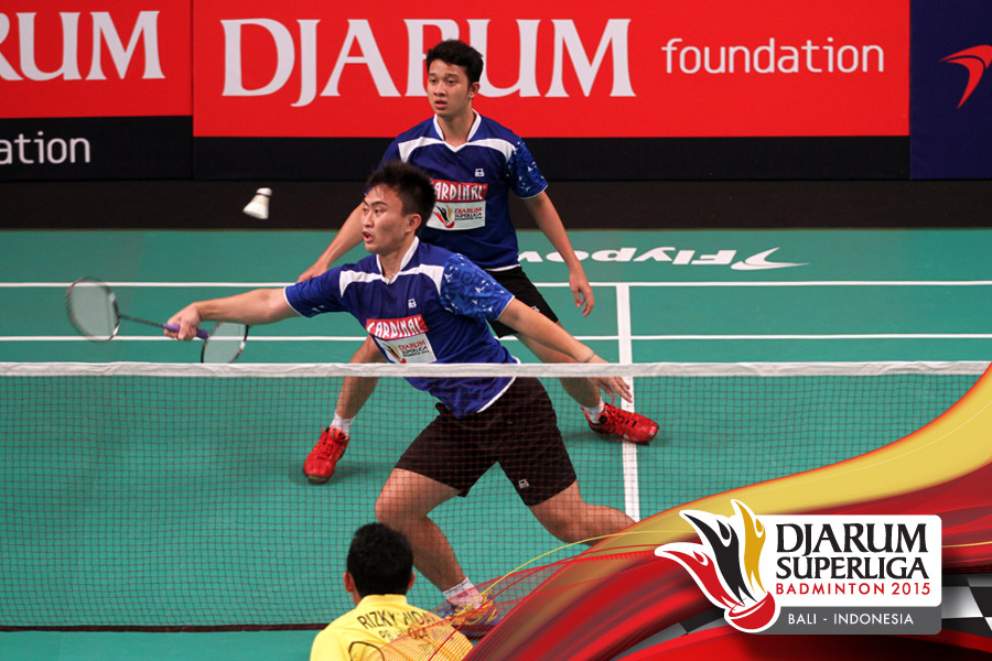 Panji Ahmad (Mutiara Cardinal) mengembalikan shuttlecock ke arah Febriyan Irvalandi (Hi Qua Wima).