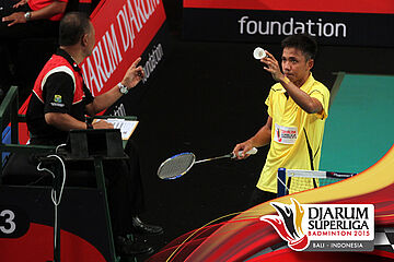 Febriyan Irvalandi (Hi Qua Wima) saat memperlihatkan kondisi shuttlecock kepada wasit.