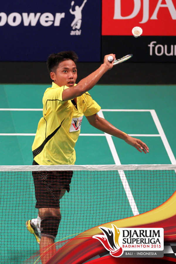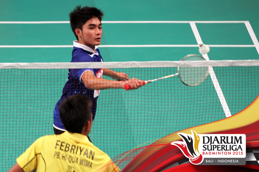 Febriyan Irvalandi (Hi Qua Wima) bersiap menyambar pengembalian tanggung yang dilepaskan Panji Ahmad (Mutiara Cardinal).