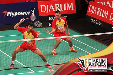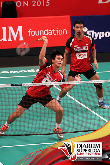Rian Agung/Trikusuma Wardhana (Jaya Raya Suryanaga) berusaha menggapai pengembalian dari Berry Angriawan/Mohammad Ahsan (Djarum Kudus).