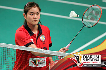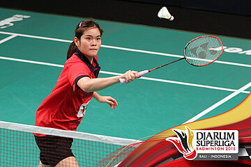 Busanan Ongbumrungpan (Jaya Raya) menghadang pengembalian tanggung dari Devi Yunia (USM Blibli).