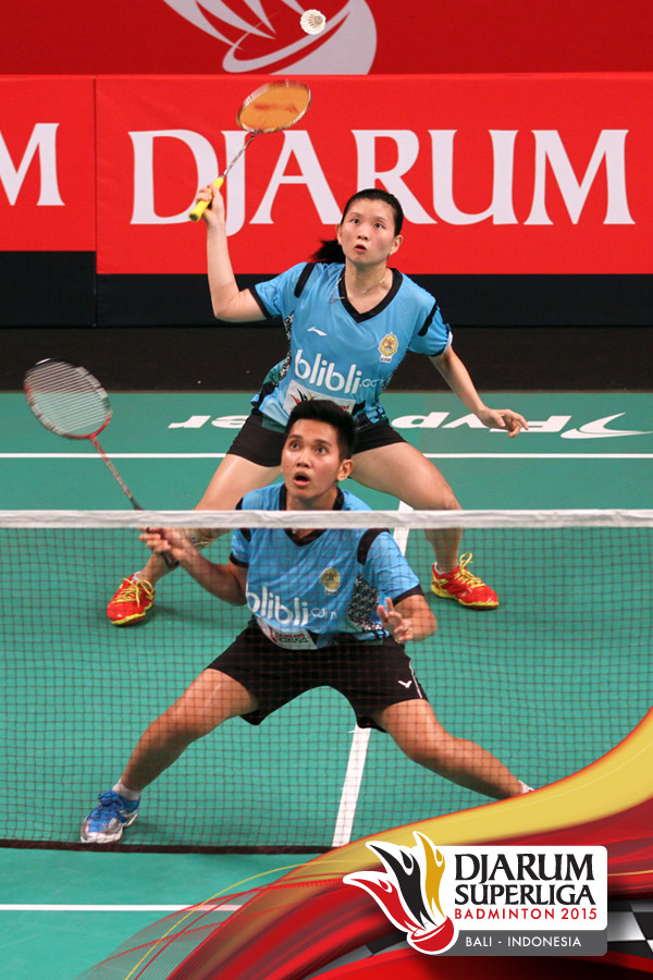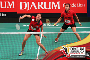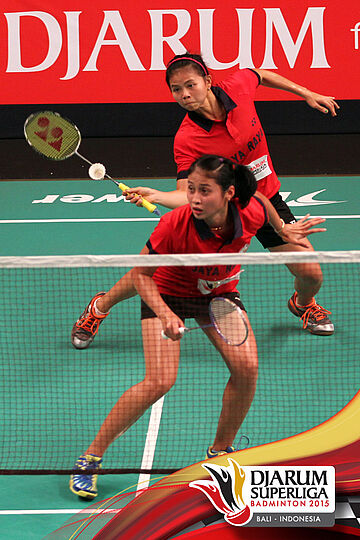 Debby Susanto/Ririn Amelia (USM Blibli) bersiap menyambut pengembalian dari Greysia Polii/Rizki Amelia (Jaya Raya).
