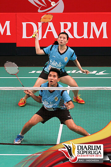 Rian Agung/Trikusuma Wardhana (Jaya Raya Suryanaga) bersiap menghadang serangan yang dilepaskan Berry Angriawan/Mohammad Ahsan (Djarum Kudus).