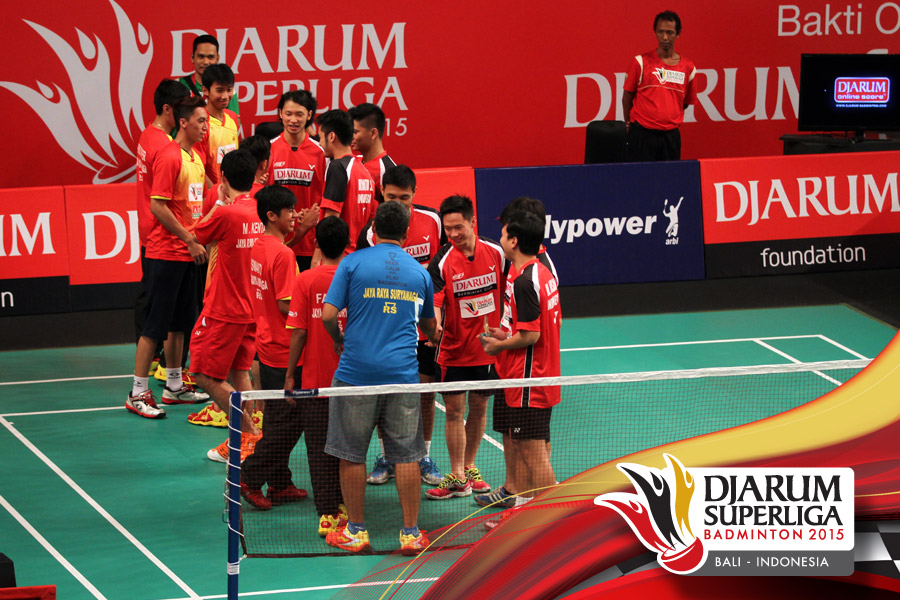 Tim Jaya Raya Suryanaga (kiri) saat bersalaman dengan Tim Djarum Kudus.