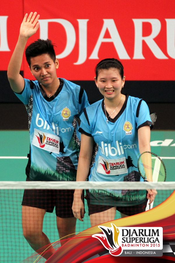 Debby Susanto/Ririn Amelia (USM Blibli) memberikan apresiasi kepada penonton di GOR Lila Bhuana yang telah mendukungnya.