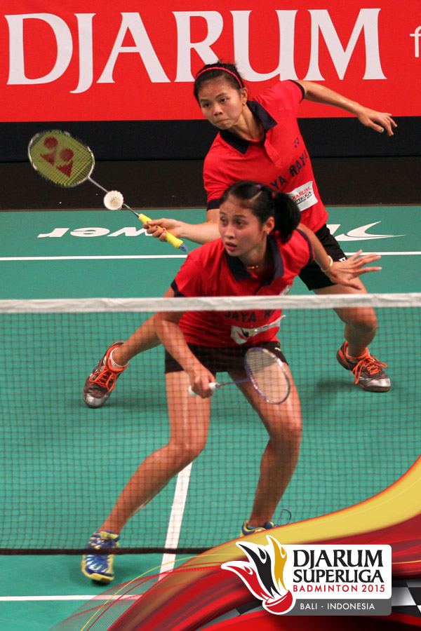 Greysia Polii/Rizki Amelia (Jaya Raya) mengembalikan shuttlecock ke arah Debby Susanto/Ririn Amelia (USM Blibli).