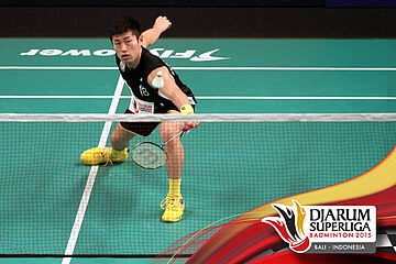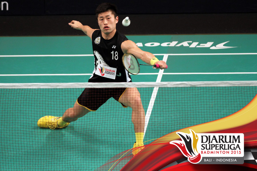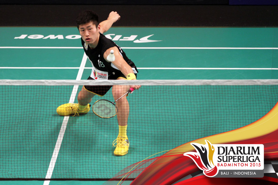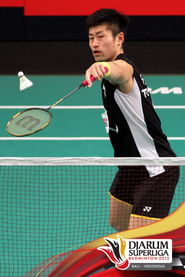 Sho Sasaki (Tonami Jepang) mengembalikan shuttlecock ke arah Antony Sinisuka (Hi Qua Wima).