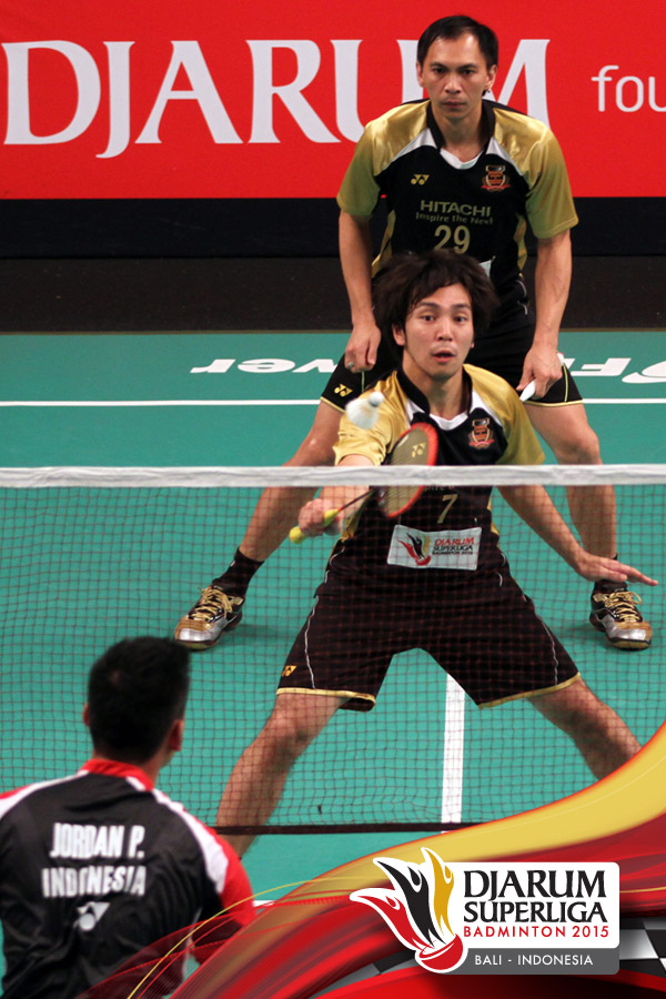 Flandy Limpele/Yuta Yamasaki (Hitachi Jepang) bersiap menghadang serangan yang dilepaskan Kevin Sanjaya/Praven Jordan (Djarum Kudus).