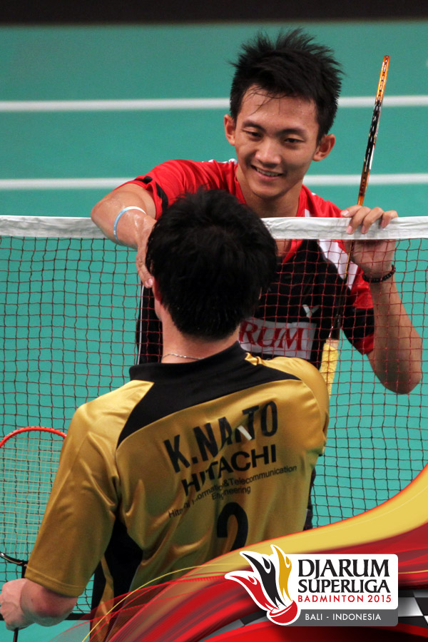 Ihsan Maulana (Djarum Kudus) bersalaman dengan Koji Naito (Hitachi Jepang).