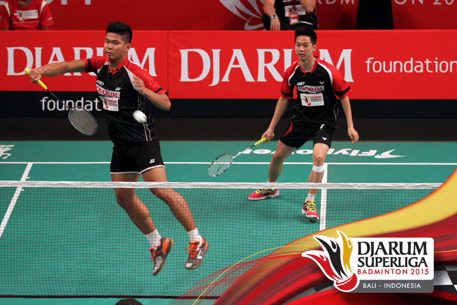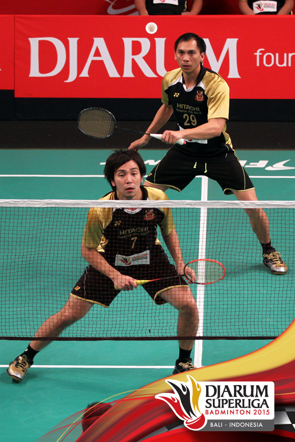 Flandy Limpele/Yuta Yamasaki (Hitachi Jepang) mengembalikan shuttlecock ke arah Kevin Sanjaya/Praven Jordan (Djarum Kudus).