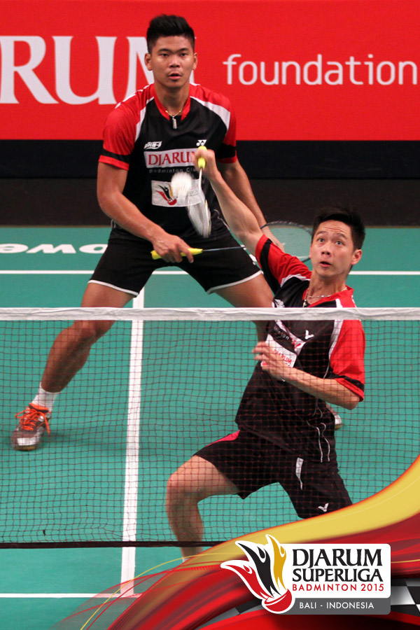 Kevin Sanjaya/Praven Jordan (Djarum Kudus) menyambar pengembalian dari Flandy Limpele/Yuta Yamasaki (Hitachi Jepang).