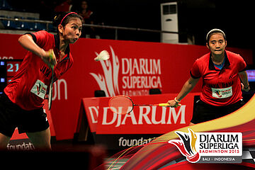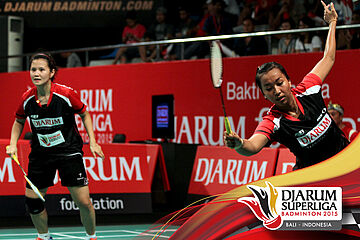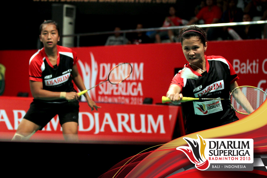 Komala Dewi/Rosyita Eka (Djarum Kudus) menghadang serangan yang dilepaskan Anggia Shita/Greysia Polii (Jaya Raya).