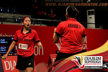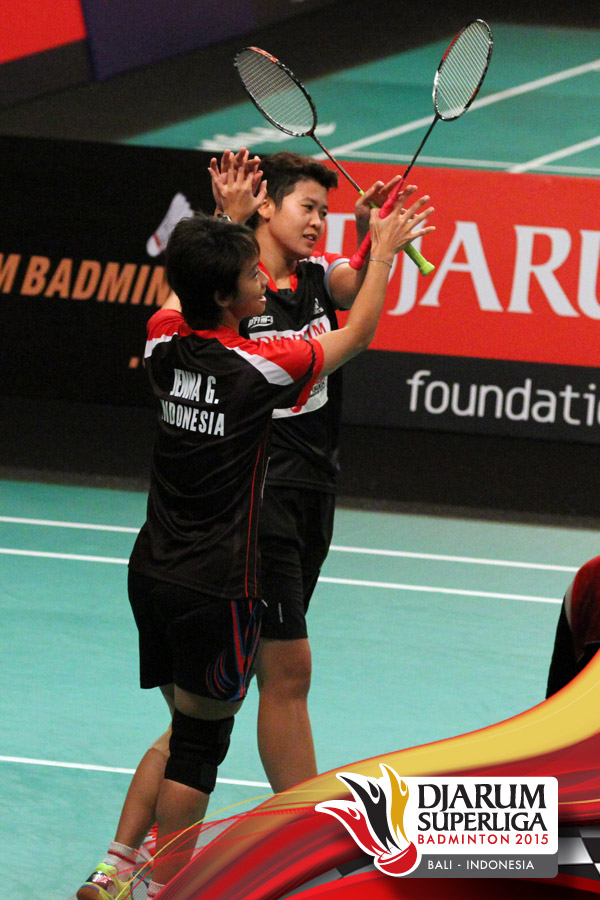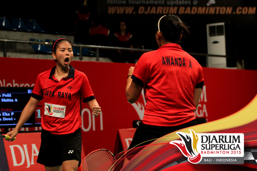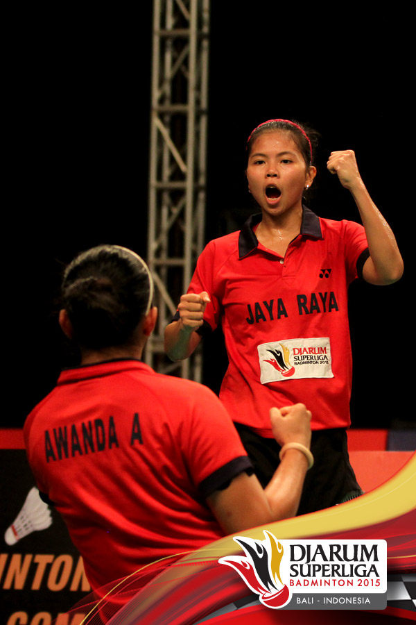 Selebrasi Anggia Shita/Greysia Polii (Jaya Raya) setelah berhasil memenangkan pertandingan melawan Komala Dewi/Rosyita Eka (Djarum Kudus).