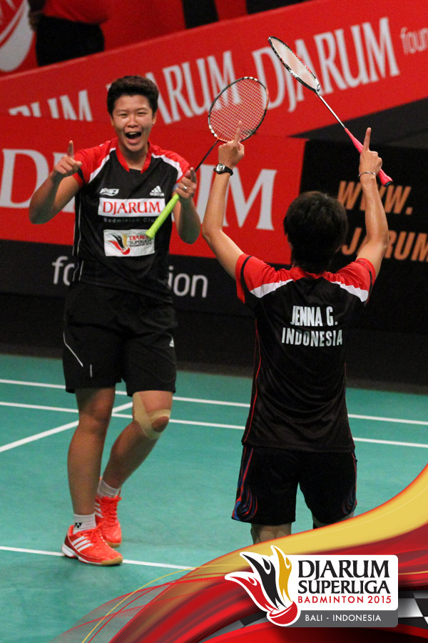 Selebrasi Jenna Ghozali/Shendy Puspa (Djarum Kudus) setelah berhasil mengalahkan Pia Zebadiah/Rizki Amelia (Jaya Raya).