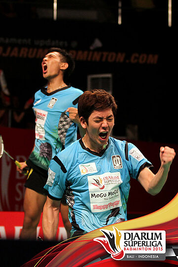 Selebrasi Fajar Alfian/Lee Yong Dae (Musica Champion) setelah berhasil memenangkan pertandingan melawan Noriyatsu Hirata/Hirokatsu Hashimoto (Tonami Jepang).