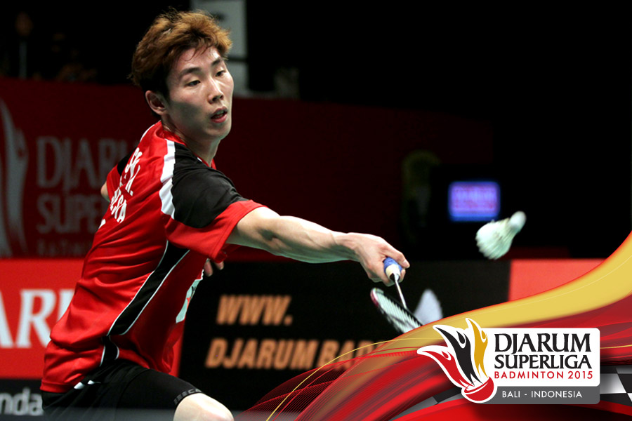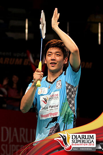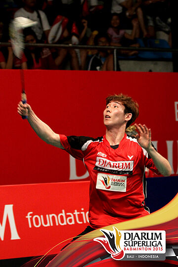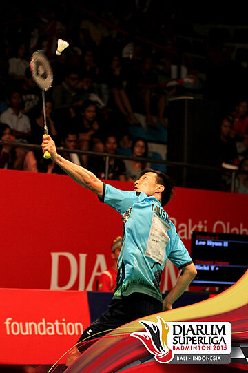Lee Hyun Il (Musica Champion) mengembalikan shuttlecock ke arah Richi Takeshita (Tonami Jepang).