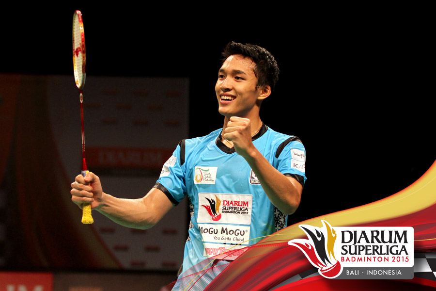 Selebrasi Jonathan Christie (Musica Champion) setelah memastikan timnya lolos ke final Djarum Superliga 2015.