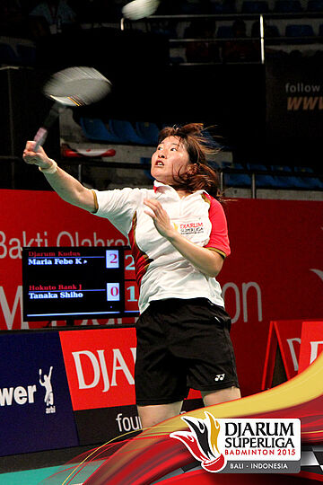 Maria Febe (Djarum Kudus) bersiap menghadang serangan dari Tanaka Shiho (Hokuto Bank Jepang).