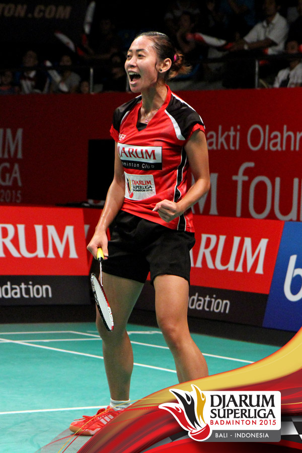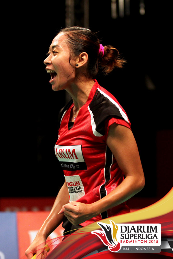 Selebrasi Maria Febe (Djarum Kudus) setelah berhasil memastikan timnya keluar sebagai juara ketiga Djarum Superliga 2015 usai mengalahkan Tanaka Shiho (Hokuto Bank Jepang).