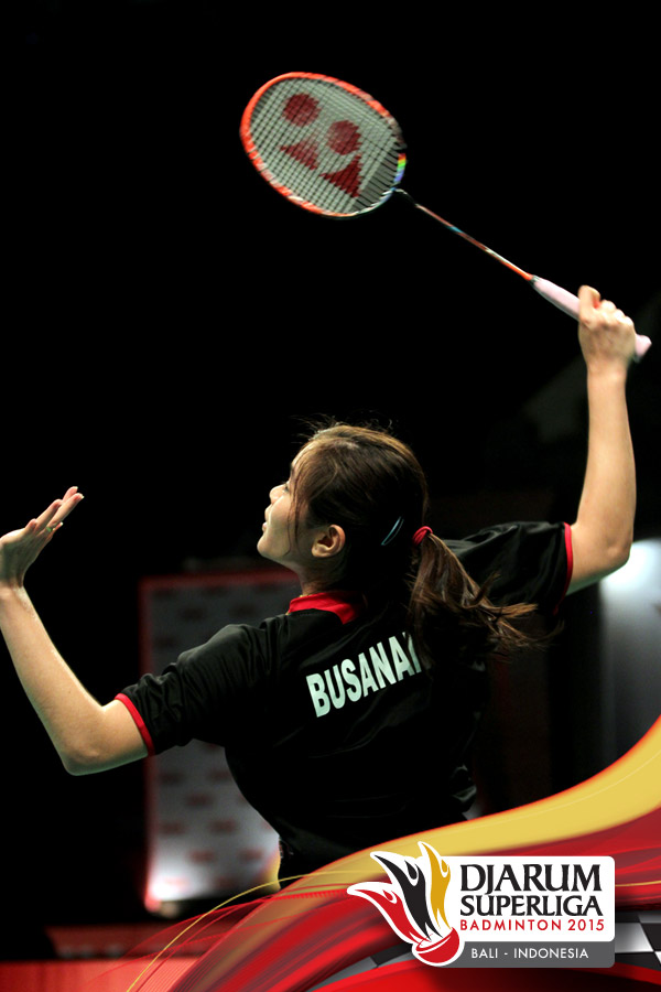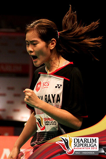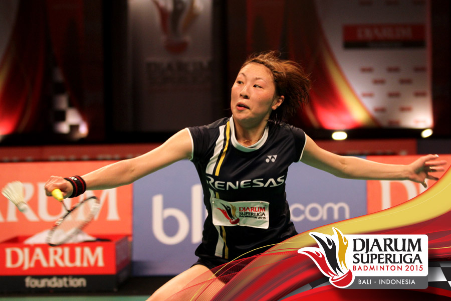 Kana Ito (Renesas Jepang) mengembalikan shuttlecock ke arah Ratchanok Intanon (Jaya Raya).