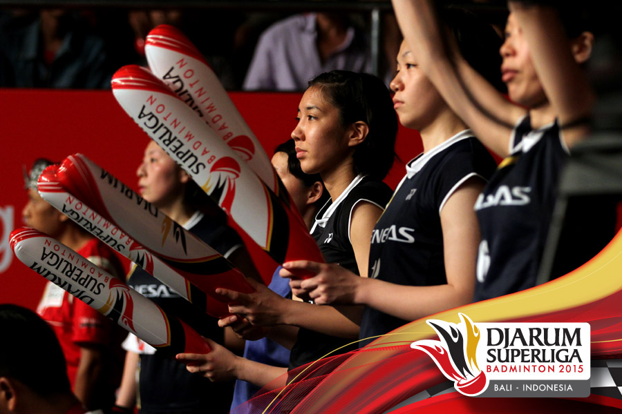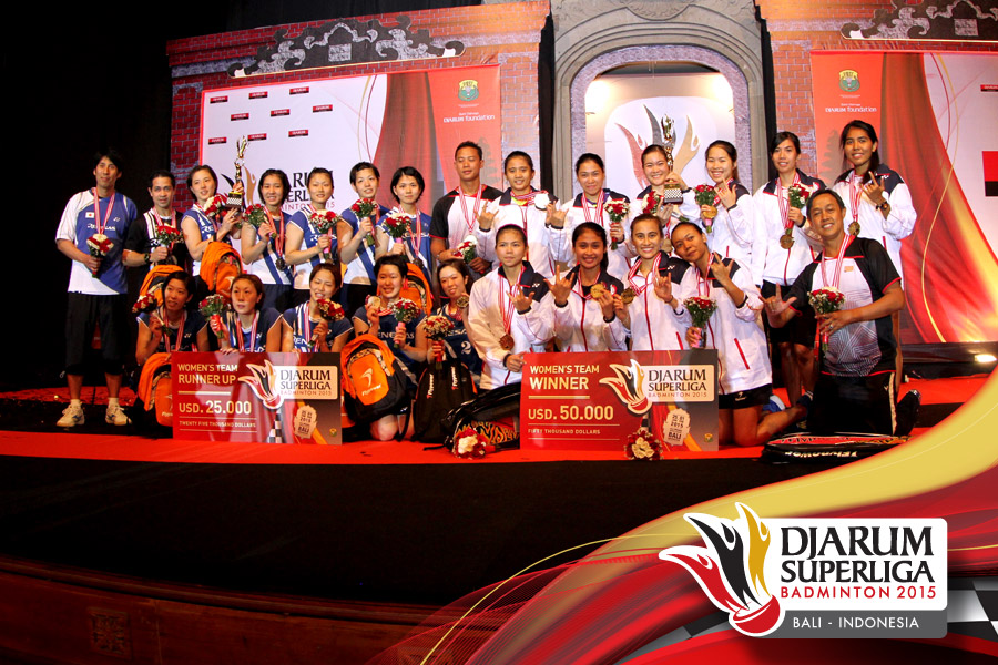 Juara putri Djarum Superliga 2015, Jaya Raya (kanan) dan runner up putri Djarum Superliga 2015, Renesas Jepang berfoto bersama.