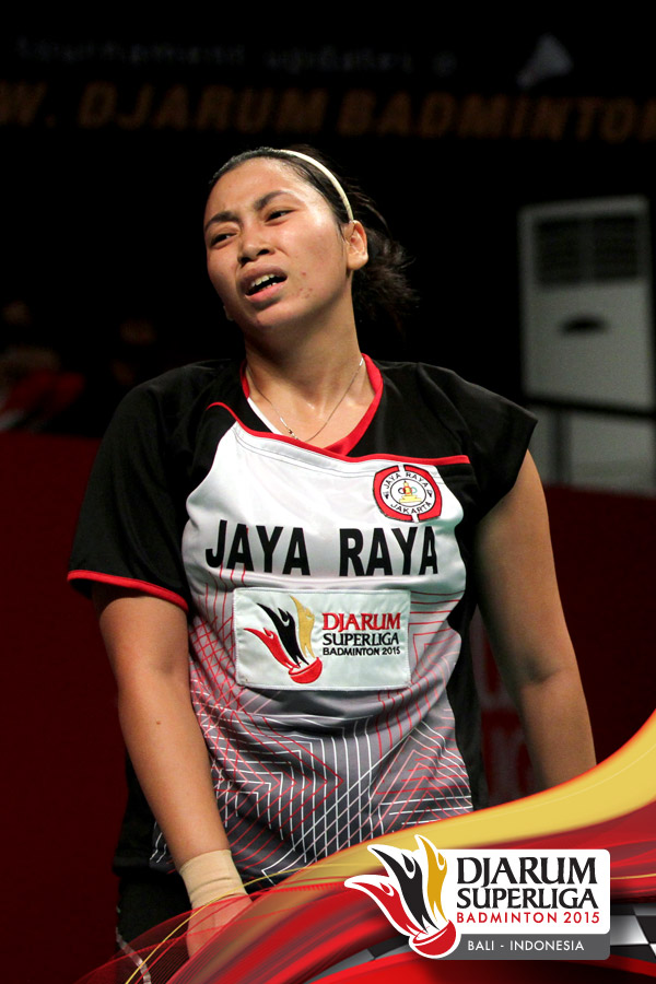 Greysia Polii (Jaya Raya) terpukau melihat dukungan yang diberikan seluruh penonton di GOR Lila Bhuana kepada timnya.