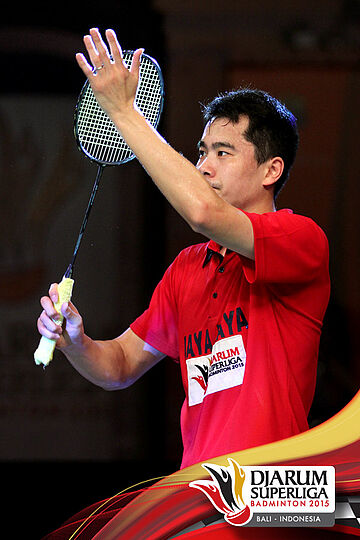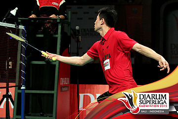 Wei Nan (Jaya Raya) mengembalikan shuttlecock ke arah Riichi Takeshita (Tonami Jepang).