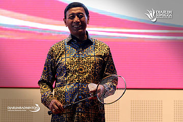 Ketua Umum PP PBSI, Wiranto bersiap membuka penyelenggaraan Djarum Superliga Badminton 2017 secara simbolis.
