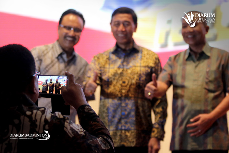 Wakil Gubernur Jawa Timur, Ketua Umum PP PBSI dan Direktur Superliga bersiap membuka Djarum Superliga Badminton 2017 secara simbolis.