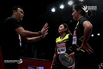 Maretha Dea Giovani/Suci Rizki Andini (PB Mutiara Cardinal) saat mendapatkan pengarahan dari pelatih.