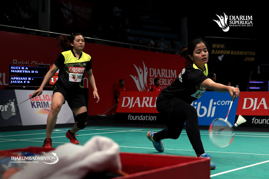 Maretha Dea Giovani/Suci Rizki Andini (PB Mutiara Cardinal) menyambut pengembalian.