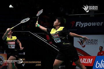 Nisak Puji/Tiara Rosalia (PB Mutiara Cardinal) menghadang serangan.