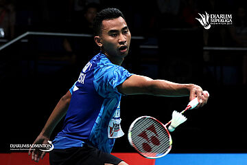 Tommy Sugiarto (PB Berkat Abadi) mengembalikan shuttlecock.