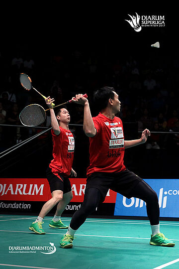 Kevin Sanjaya/Mohammad Ahsan (PB Djarum) bersiap menyambut pengembalian.